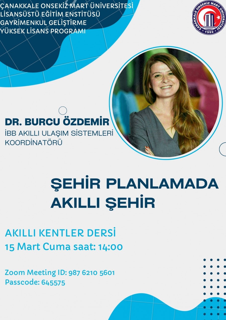 Dr. Öğr. Üyesi İpek Sakarya'nın vermekte olduğu "Akıllı Kentler" dersi kapsamında İstanbul Büyükşehir Belediyesi Akıllı Ulaşım Sistemleri Koordinatörü Dr. Burcu Özdemir tarafından "Şehir Planlamada Akıllı Şehir" sunumu 15 Mart Cuma günü saat 14:00'te çevrimiçi olarak gerçekleştirilmiştir.